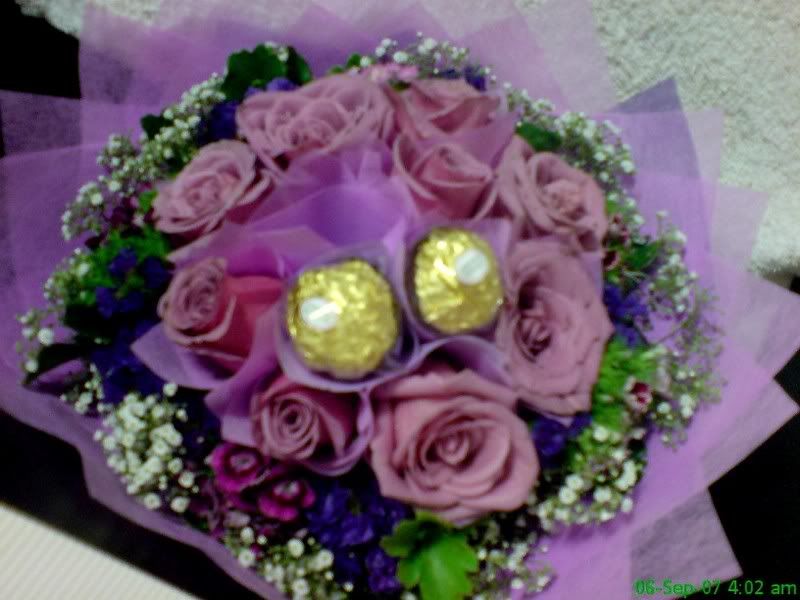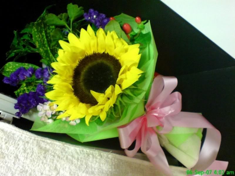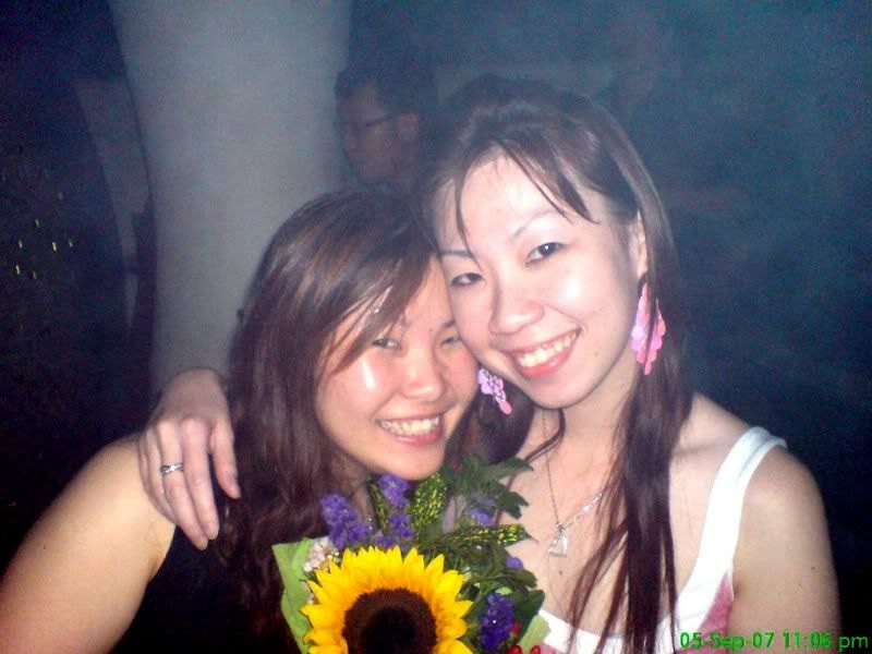 Then we hop from Phuture to Zouk to Phuture and Zouk again...lol. Guess we are there too early tat's y no music from both areas. Was toking rubbish with Shaun, Joe they all..lol. Jacq mui actually ask Jimmy to get her a sunflower for me to cheer me up. Omg, when they are here, I got 2 bouquets! One sunflower from my dearest jacq mui and another bouquet of purple roses (with 3 rochers) from Jimmy! They are really so sweet. They just wanted to cheer me up after what had happened for the past week. So sweet of them! I love them!